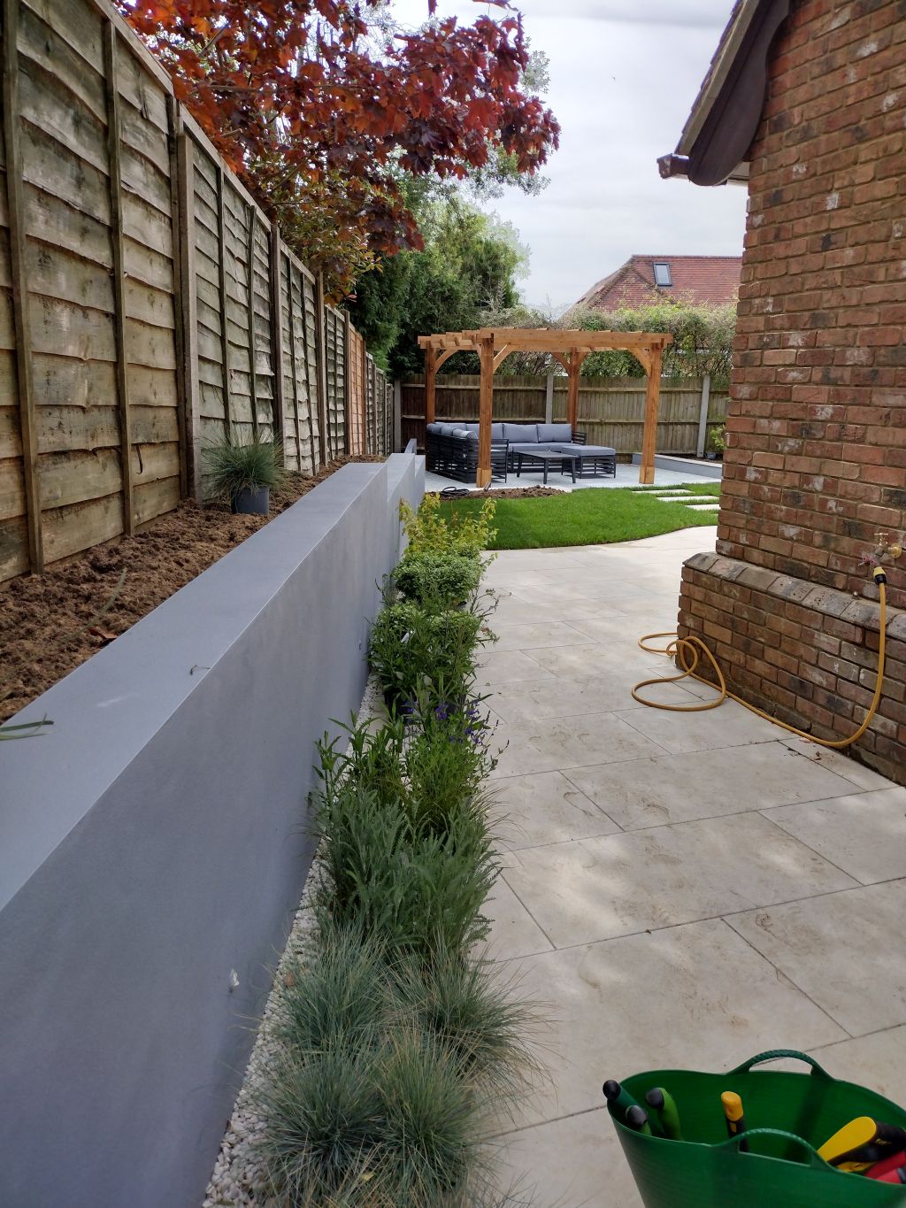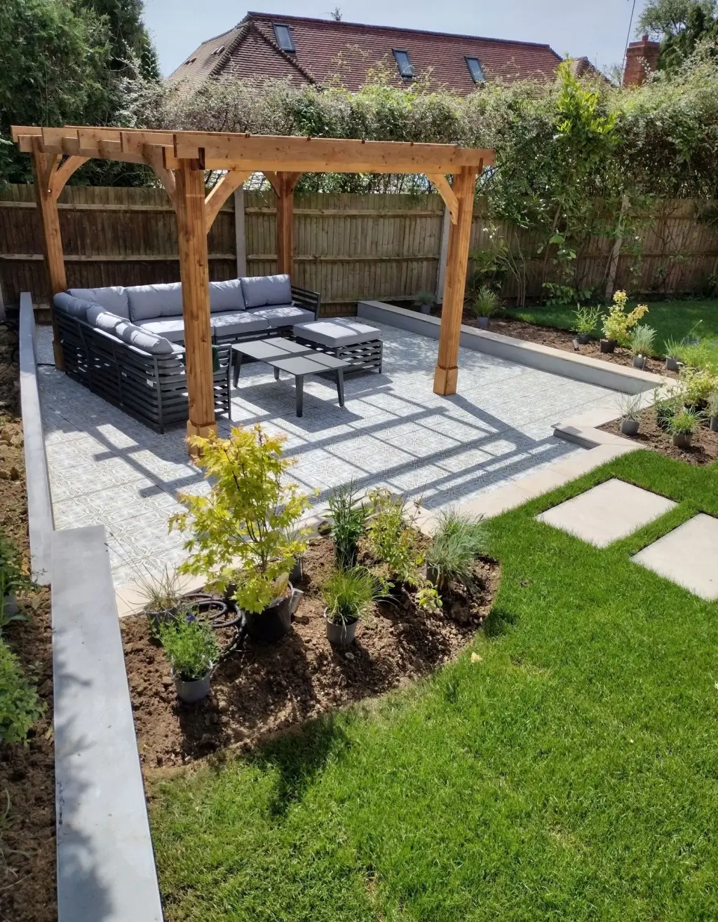 The sloping garden needed a split-level design, leading to a sunken seating area for a practical and inviting outdoor space. Each level was planned to improve access and usability, ensuring a smooth transition between areas while making the most of the site.