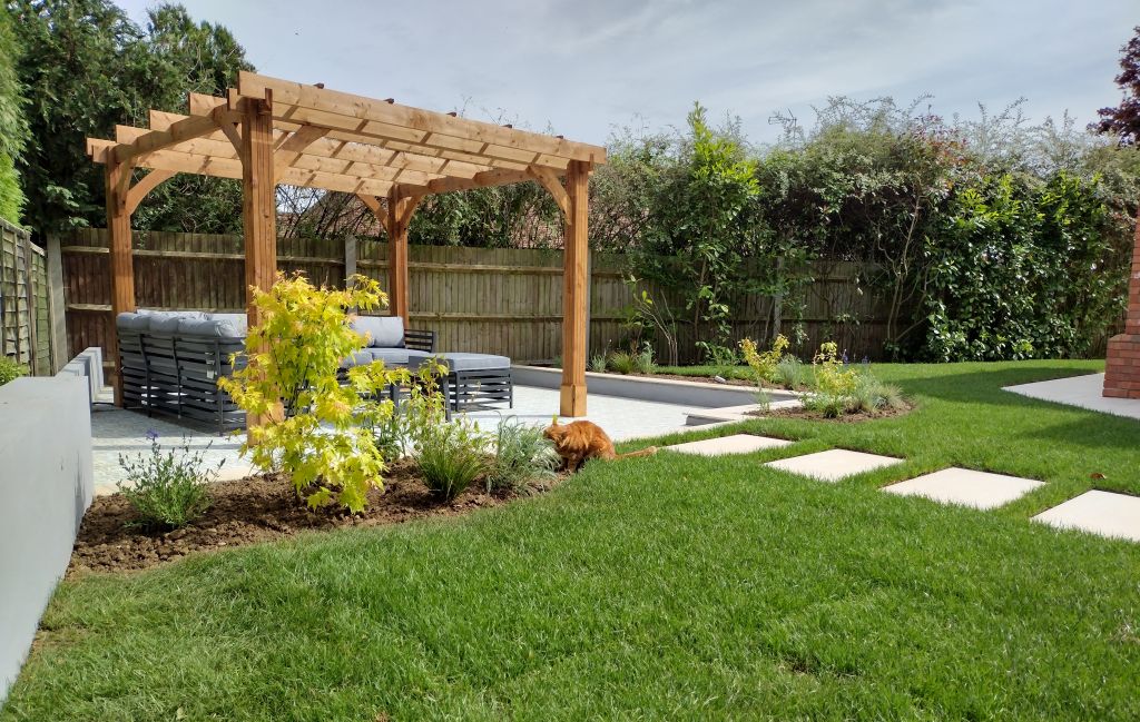 The client’s cat enjoyed exploring the grasses, moving through them and adding an unexpected but playful element to the space. By combining practical hardscaping with low-maintenance planting, we transformed a difficult site into a useful and attractive garden. The result is a functional outdoor area, perfect for relaxing, socializing, and enjoying nature in all seasons.