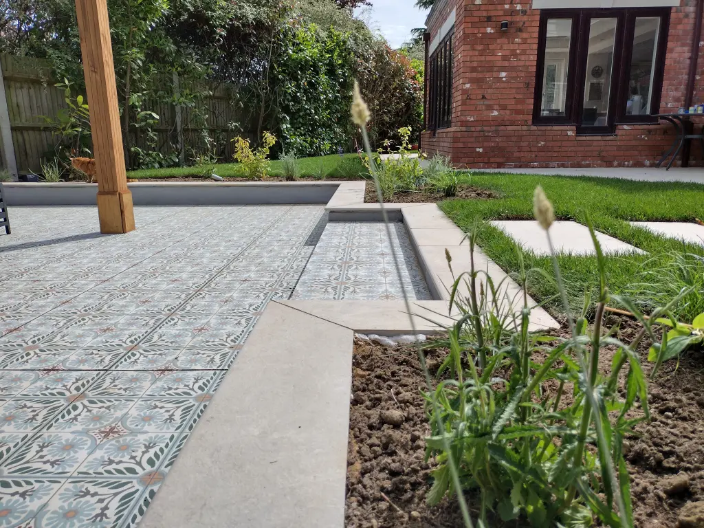 We used porcelain ‘Botanic’ tiles to add beautiful floral detail to complement Global Stone’s Siena range ‘Gerusalem’ porcelain for a cohesive paving finish. These tiles introduced subtle colour variation, tying into the planting scheme and creating visual interest throughout the garden.